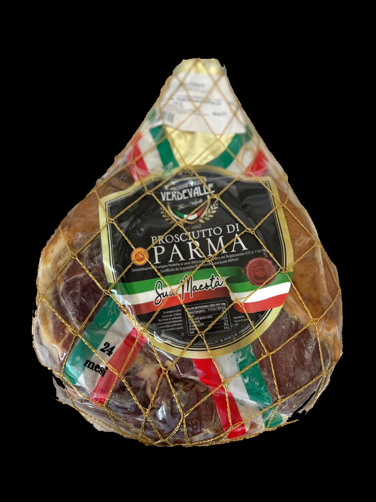 DESCRIZIONE: Prosciutto crudo di Parma D.O.P. stagionato, disossato, pressato, sottovuoto, ottenuto da cosce suine fresche provenienti da macelli selezionati nei territori previsti dal disciplinare, di pezzatura Kg. 8,5+